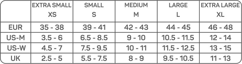 XS: 3.5-6 (M) / 4.5-7 (W) , S: 6.5-8.5 (M) / 7.5-9.5 (W) , M: 9-10 (M) / 10-11 (W) , L: 10.5-11.5 (M) / 11.5-12.5 (W) , XL: 12-14 (M) / 13-15 (W)